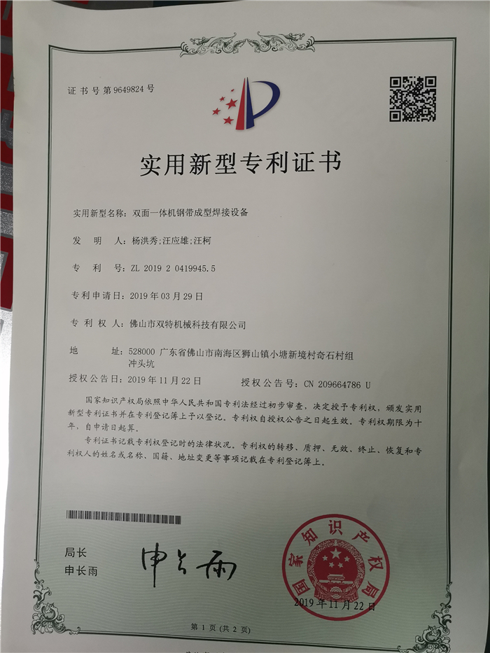 雙特制管機(jī)專利證書